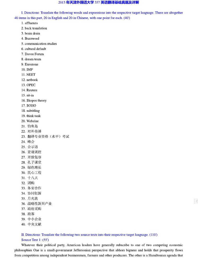 2018年南京大学硕士研究生考试自命题回忆版 02 英语翻译基础(357)(150 points) Ⅰ. English and Chinese Translation: (40 points) 1. AD 2. APEC 3. ASAP 4. Brexit 5. BRICS 6. G20 Summit 7. Internet things 8. netizen 9. shopaholic 10. UNESCO 11. 一带一路倡议 12. ...