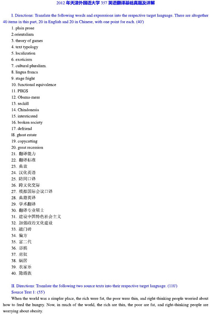 考研报考信息 本站小编 免费考研网 2017-09-17357 英语翻译基础复习提纲一、考试总体要求1.英语翻译基础考试是全日制翻译硕士专业学位(MTI)研究生入学考试的基础课考试科目,其目的是考查考生的英汉互译实践能力是否达到进入MTI学习的水平。2.本考试是测试考生是否具备基础翻译能力的尺度参照性水平考试。考试范围包括MTI 考生入学应具备的英语词汇 ...