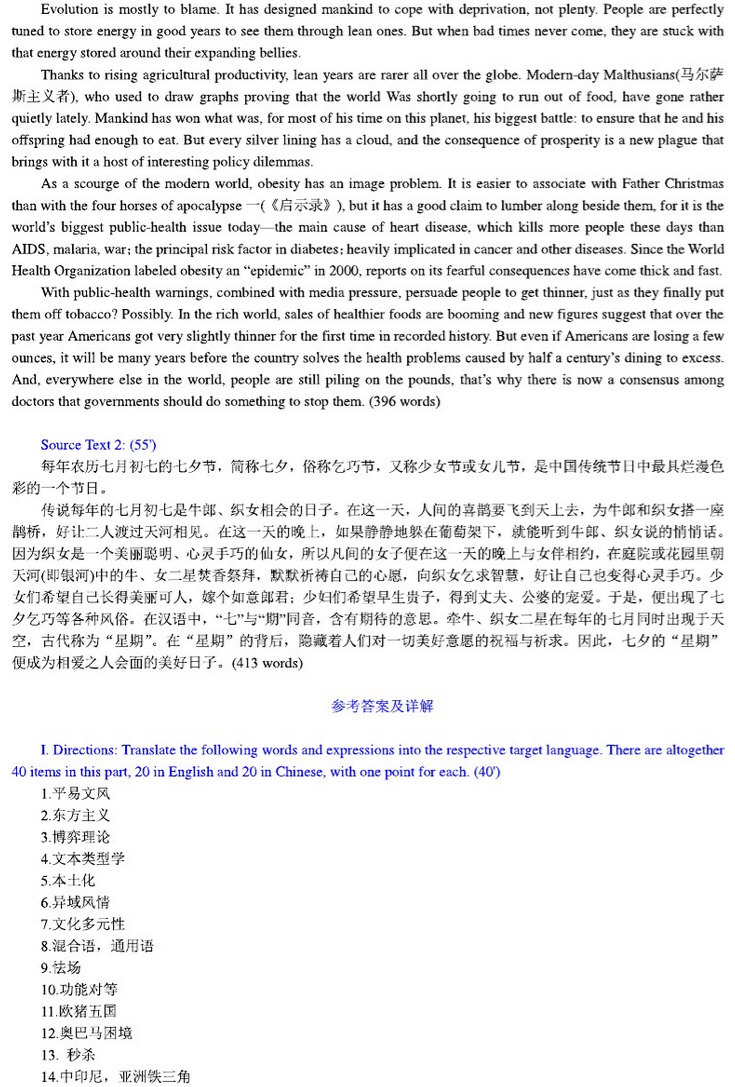 357-英语翻译基础一、考试目的《X语翻译基础》是全日制翻译硕士专业学位研究生入学考试的基础课考试科目,其目的是考察考生的外汉互译实践能力是否达到进入MIT学习阶段的水平。二、考试性质及范围:本考试是测试考生是否具备基础翻译能力的尺度参照性水平考试。考试的范围包括MTI考生入学应具备的外语词汇量、语 ...