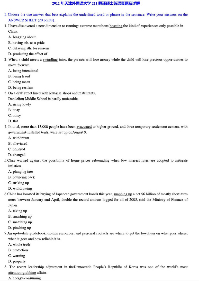 2018年南京大学硕士研究生考试自命题回忆版 02 英语翻译基础(357)(150 points) Ⅰ. English and Chinese Translation: (40 points) 1. AD 2. APEC 3. ASAP 4. Brexit 5. BRICS 6. G20 Summit 7. Internet things 8. netizen 9. shopaholic 10. UNESCO 11. 一带一路倡议 12. ...