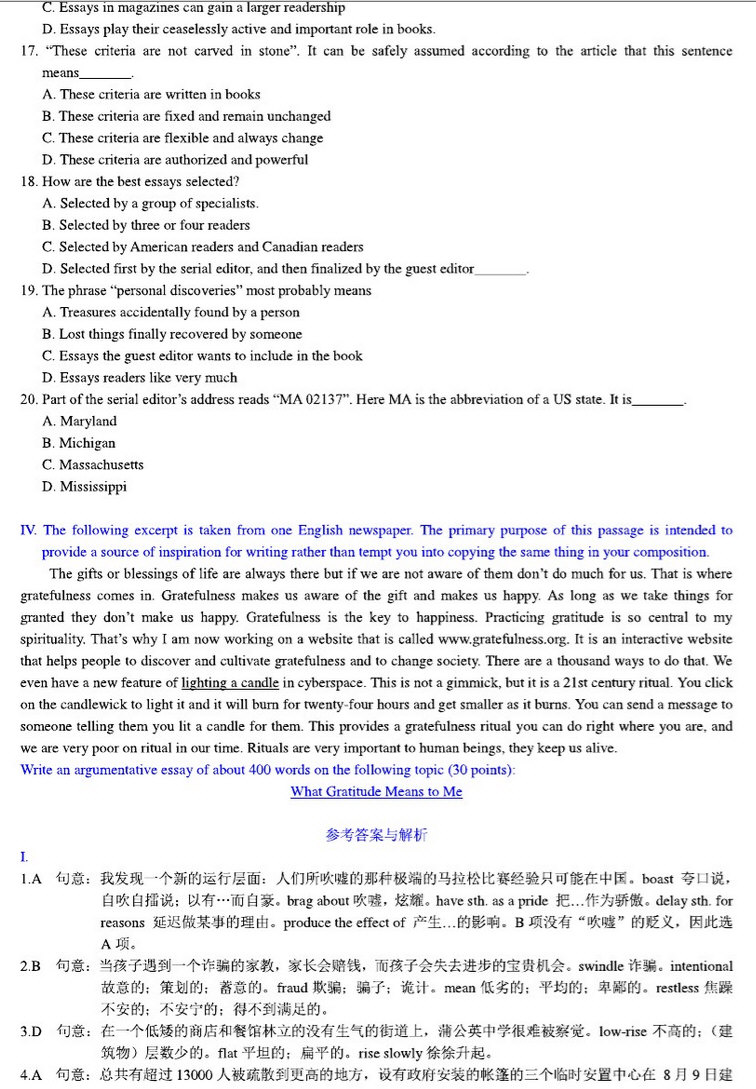 西安交通大学2018翻译硕士英语考研真题211翻译硕士英语(回忆版)1. Colze 完形填空20题,30分celebrity 名人2. 阅读2篇-选择10题,20分3. 阅读2篇-问答10题,20分4. 作文-材料:AI and educationTask 1:总结文章要点,100字(10分)Task 2:话题:Living in a world with AI ,300字(AI,artificialintelligence) (20分)(1)W ...
