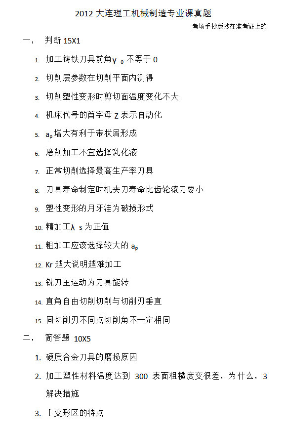 2012大连理工大学机械制造专业课初试考研真题