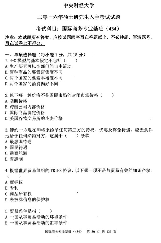 中央财经大学2016国际商务专业基础(434)考研真题