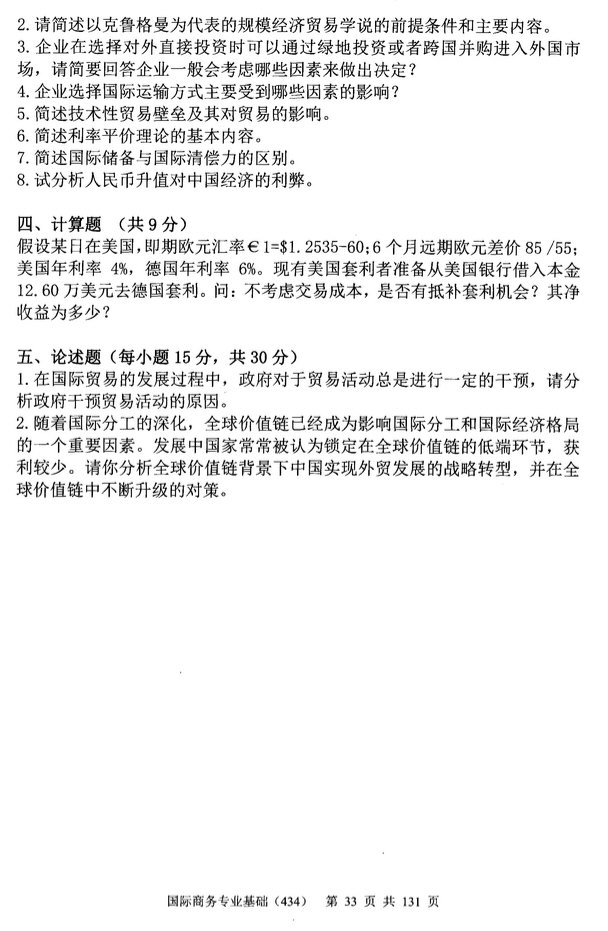 专业课大纲 本站小编 免费考研网 2018-01-02434-国际商务专业基础一、考试性质《国际商务专业基础》是2011年国际商务硕士(MIB)专业学位研究生入学统一考试的科目之一。《国际商务专业基础》考试要力求反映国际商务硕士专业学位的特点,科学、公平、准确、规范地测评考生的专业基础素质和综合能力,以利于选拔具有发展潜力的优秀人才入学,为国家开放型经 ...