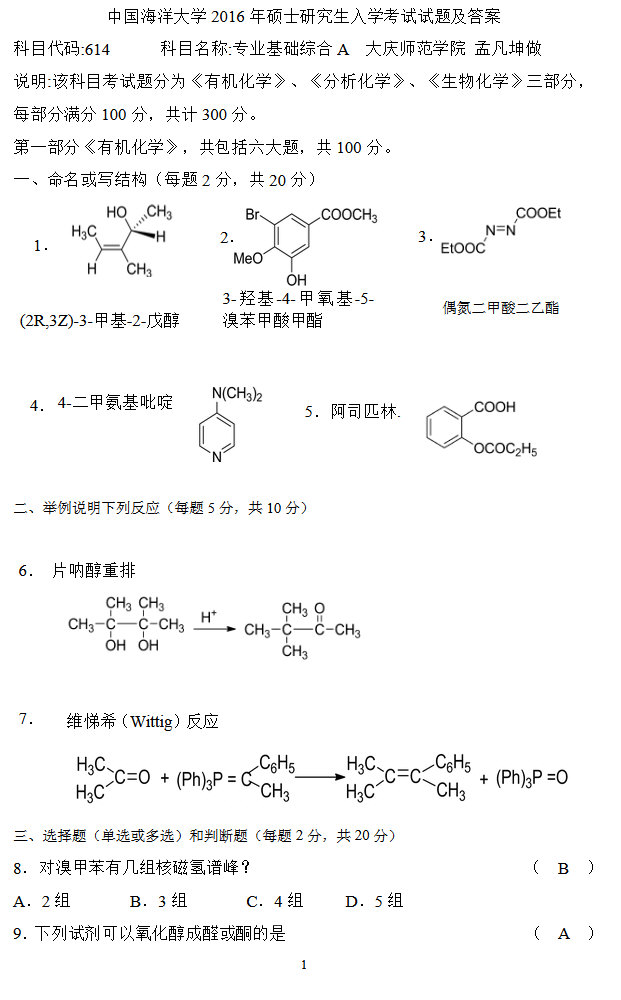 专业课考研经验 本站小编 FreeKaoyan 2018-01-23一.选择题(20题)(1)林德拉试剂的组成(2)物质R,S构型判断(3)SN1,SN2反应的区分与速率比较(4)2009年诺贝尔化学奖研究方向(5)几种物质IR波数大小比较(炔,烯等)(6)几种不同结构的酮的反应活性(7)区分一对旋光异构体(名字忘记了)所用到四大谱中哪一个较合适(8)几种环酮,共轭 ...