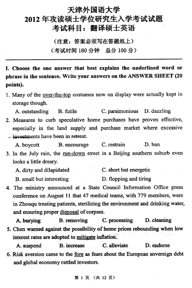 天津外国语大学2012翻译硕士英语考研真题