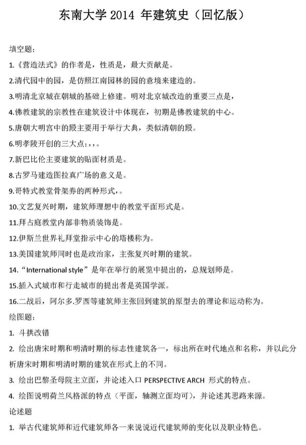 东南大学2014 年建筑史(回忆版) 填空题: 1. 《营造法式》的作者是,性质是,最大贡献是。 2. 清代园中的园,是仿照江南园林的园的意境来建造的。 3. 明清北京城在朝城的基础上修建。明对北京城改造的重要三点是, 4. 佛教建筑的宗教性在建筑设计中体现在,初期是佛教建筑的中心。 5. 唐朝大明宫中的殿主要用于举行大典, ...