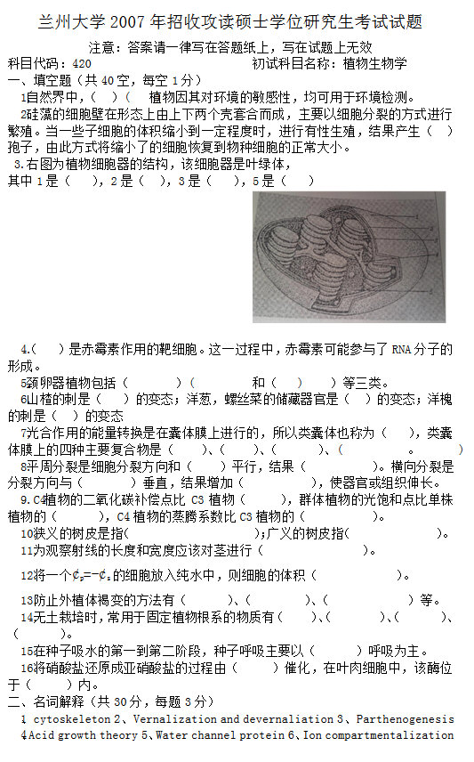 《植物生物学》考试大纲一、考试性质2017年学术型学位研究生入学统一考试专业课程考试科目为《植物生物学》,包括《植物学》和《植物生理学》两部分内容。二、考试要求要求考生了解植物科学发展简史,能够系统理解和掌握植物生物学基本概念、基础理论知识和基本实验技能,并能够运用植物生物学基本原理和方法综合分析、 ...