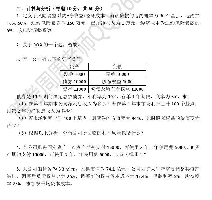 中央财经大学2016年金融学综合(431)真题 三、计算题 1.调整内部收益率MIRR的计算 2.欧式看涨期权定价(二叉树法) 3.MM定理框架下计算WACC,股票回购价格 四、名词解释: 1.常备借贷便利SLF 2.双重期权 3.强制储蓄效应 4.累积优先股 5.财务协同效应 五、简答题 1.简述汇率变化影响金融资产价格的机制 2.简述 ...