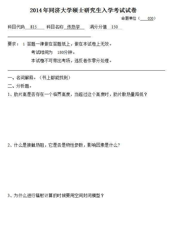 2013,2014年同济大学815传热学考研试题(6)