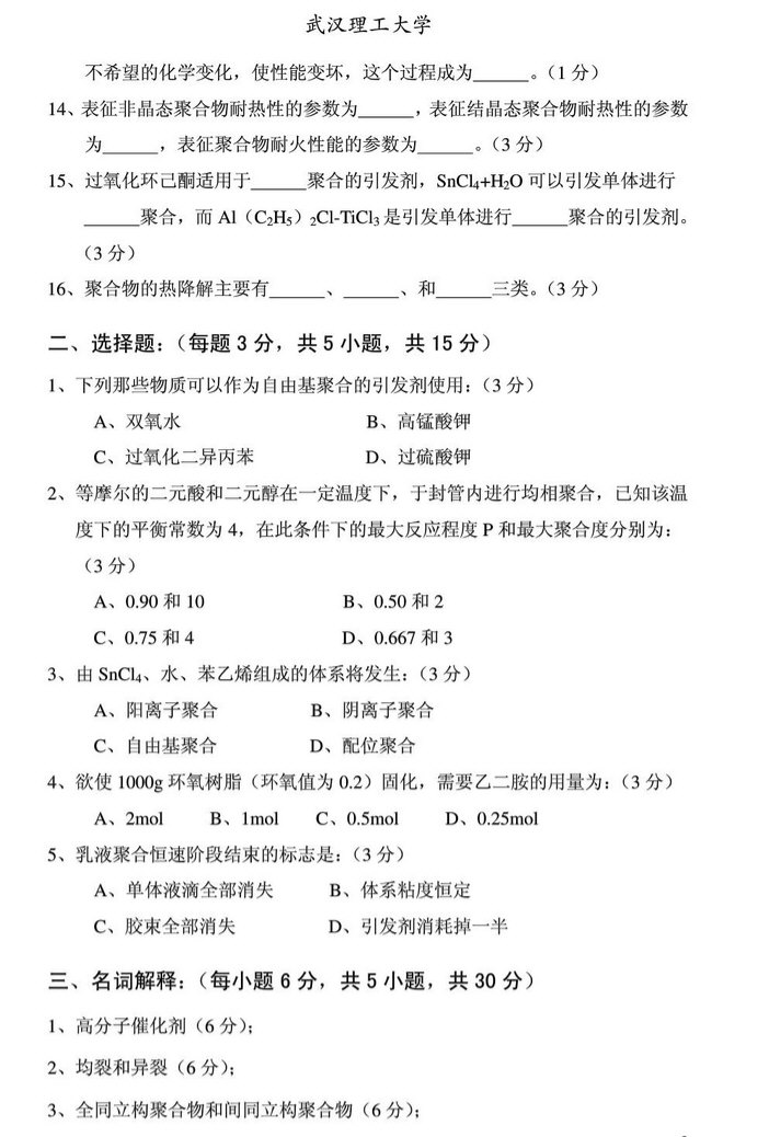 武汉理工大学材料学院2011高分子化学考研真题(2)