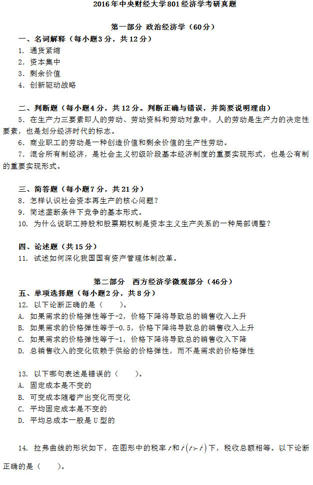 专业课考研资料 本站小编 免费考研网 2018-03-132015年中央财经大学 801经济学考研真题一、政治经济学(60分)一、名词解释(每题 3分,共 18分)1.社会必要劳动时间2.货币流通规律3.流动资本4.虚拟资本5.资本有机构成6.极差地租二、简述题(每题 7分,共 21分)7.简述马克思主义所有制理论的主要内容。8.简述我国宏观调控的目标和手段。9.简述马克思设想的按劳分配的前提条件和基 ...
