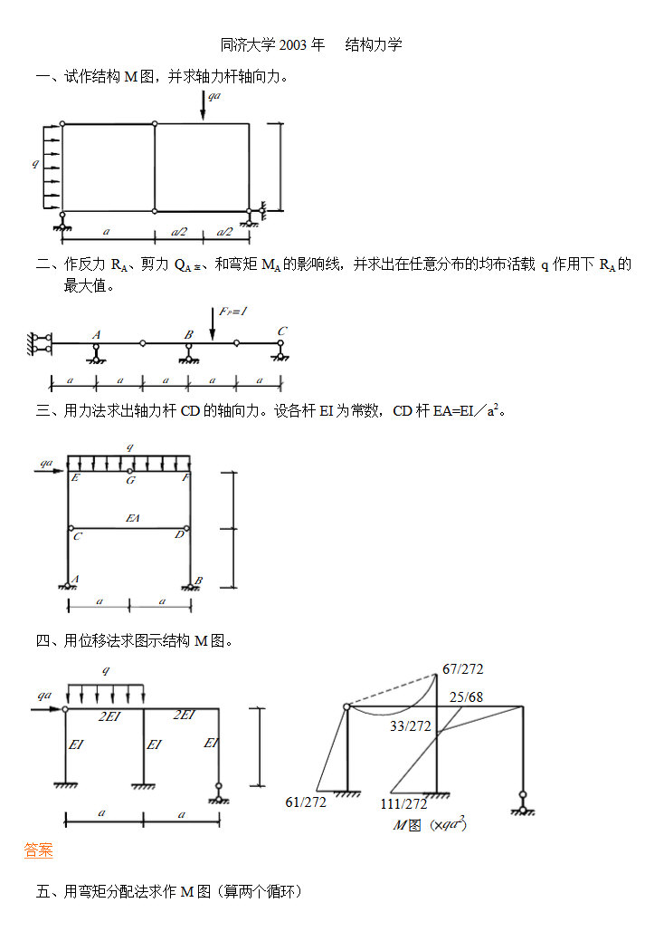 同济大学2004-2003土木结构力学考研试题(7)