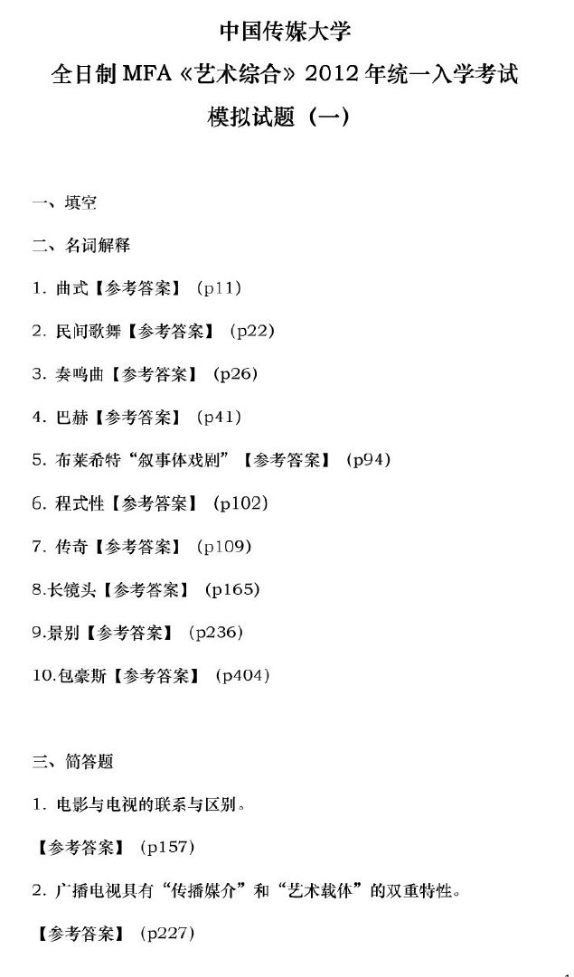 中国传媒大学全日制MFA《艺术综合》2012年统一入学考试模拟题(三套卷)