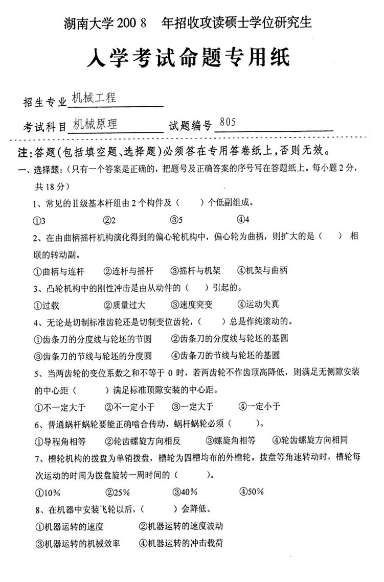 2008,2007,2005,2004年湖南大学机械原理考研真题原版