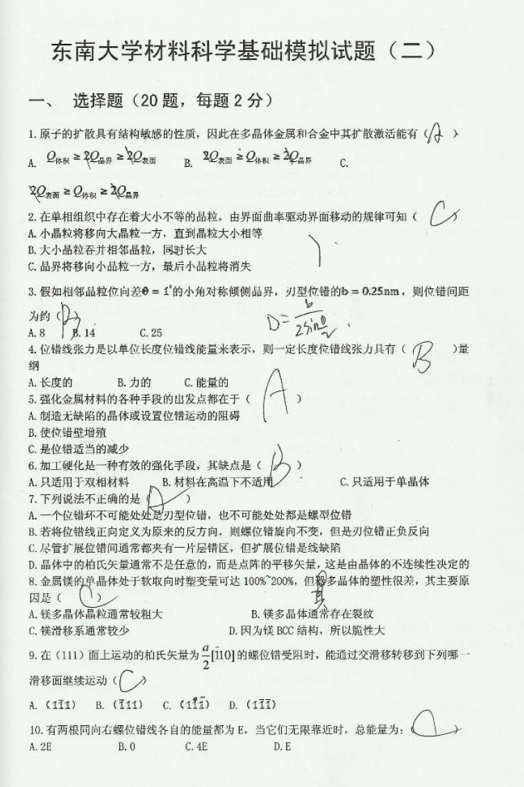 东南大学材科科学基础考研模拟题练习题带答案