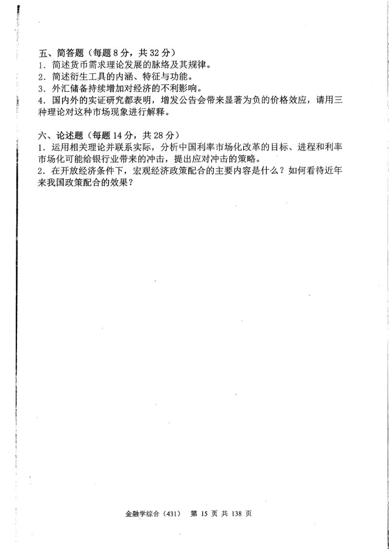 中央财经大学2015-2011金融学综合431考研真题(14)