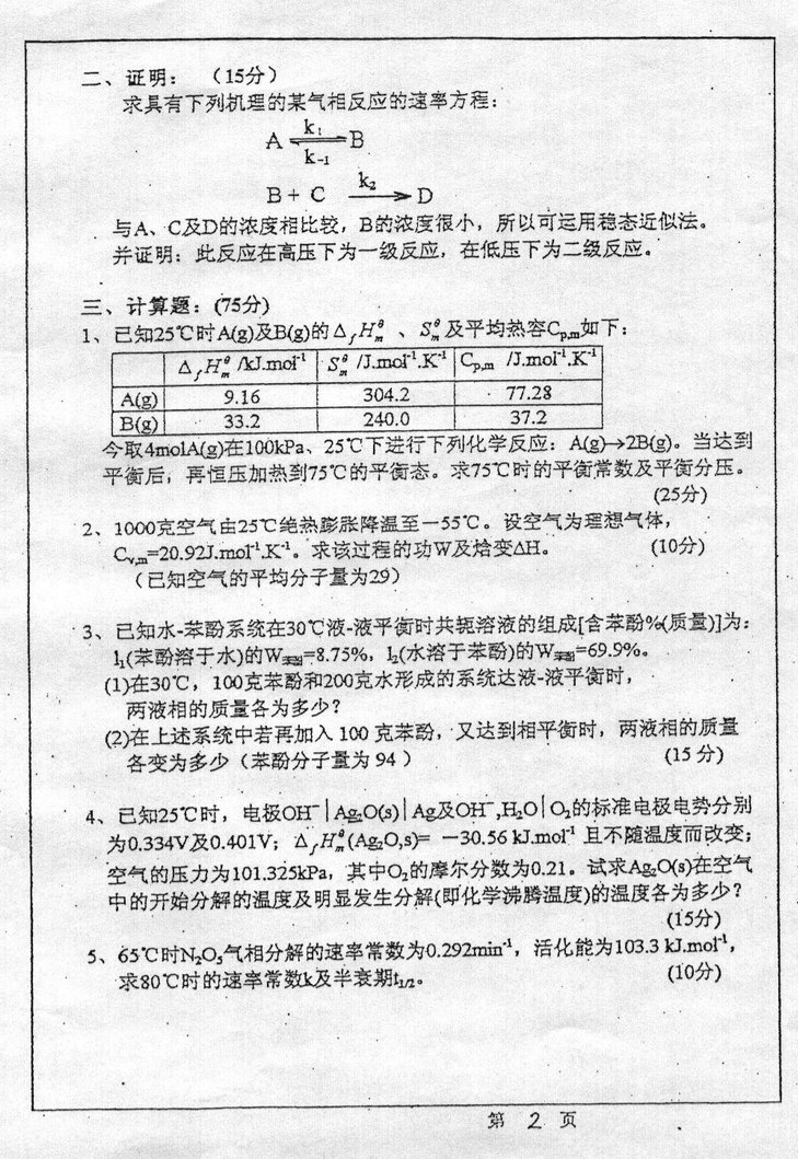 • 中国石油大学(华东)2000年考研真题-物理化学