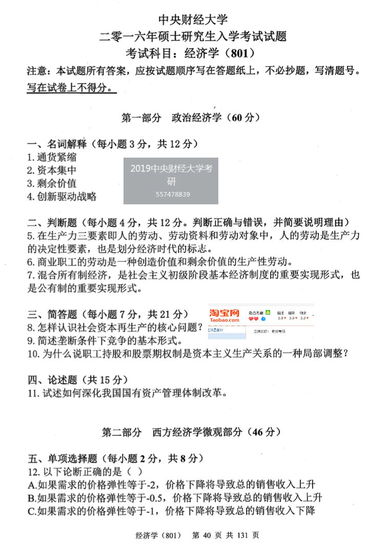 专业课考研资料 本站小编 免费考研网 2018-03-142013年中央财经大学801经济学考研真题及详解