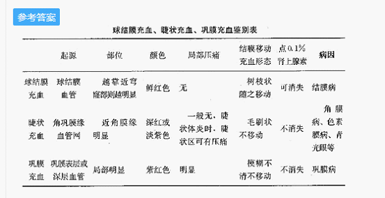 38. 结膜充血和睫状充血以及巩膜充血的鉴别:
