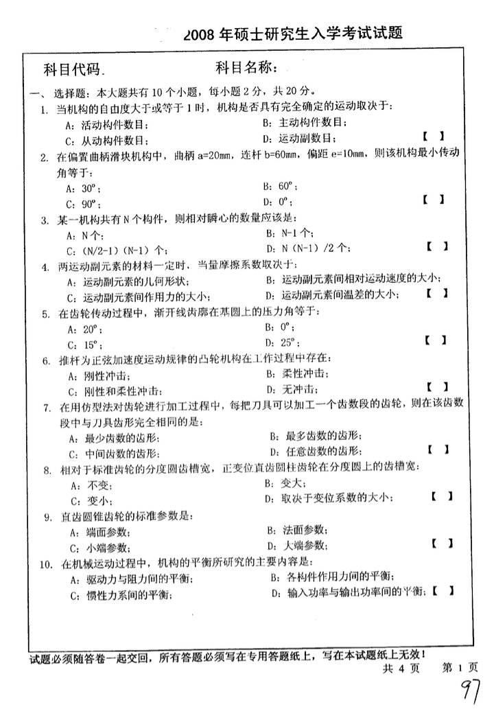 专业课考研资料 本站小编 免费考研网 2018-03-242008同济大学机械原理考研试卷