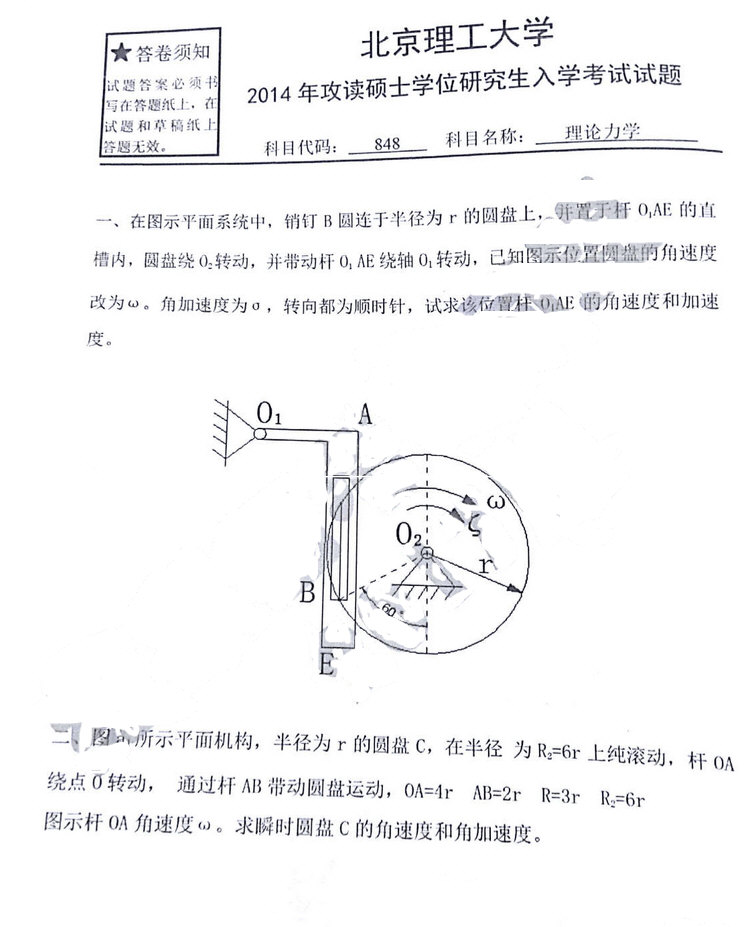 2014北京理工大学848理论力学考研真题
