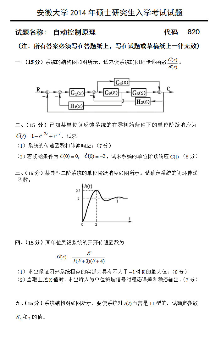 安徽大学2014年自动控制原理820考研真题