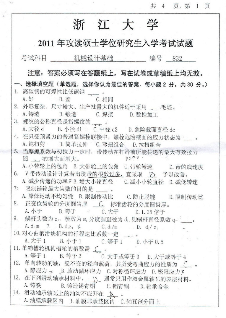 一共6个题,题型跟09年一样,选择 判断 简答 计算 设计和分析 结构设计1 15个选择,往年题的重复2 10个判断,难度一般3 简答题3个,螺纹连接的防松方法和预紧力如何控制大小凸轮传动和连杆传动的各自特点并举例说明应用用带传动、链传动和齿轮传动(蜗轮传动)设计两种方案实现从1500到15的传动 ...