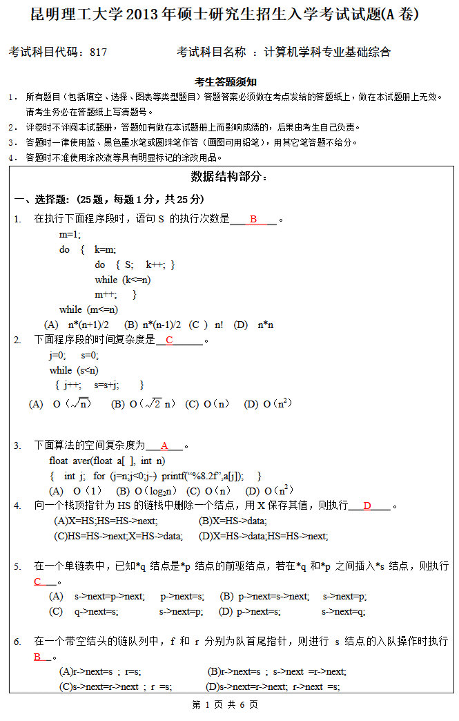 2013年研究生昆明理工大学计算机818考试题目和答案