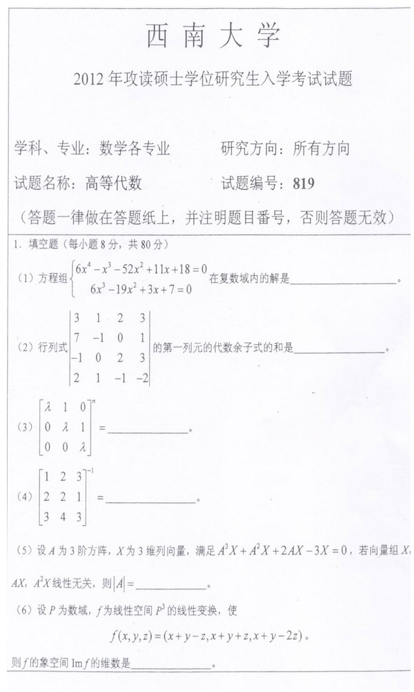 西南大学2012数学分析高等代数数学专业考研真题资料