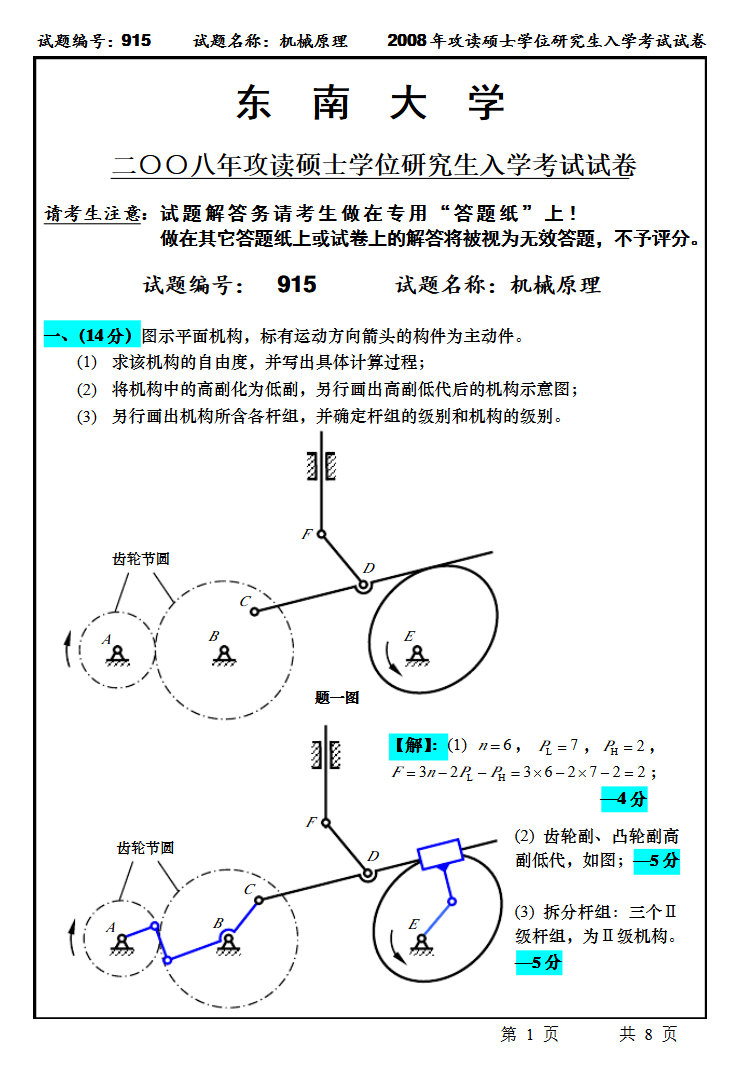 清华大学机械原理各章重点、难点总结 第1章 机构的组成和结构 机构运动简图的绘制、运动链成为机构的条件和机构的组成原理是本章学习的重点。 1. 机构运动简图的绘制 机构运动简图的绘制是本章的一个重点,也是一个难点。初学者一般可按下列步骤进行。 ① 分析机械的实际工作情况,确定原动件(驱动力作用的构件)、机架 ...专业课考研资料 本站小编 免费考研网 2018-04-09东南大学2003-2007机械原理考研真题详细答案(已经按知识点分类)