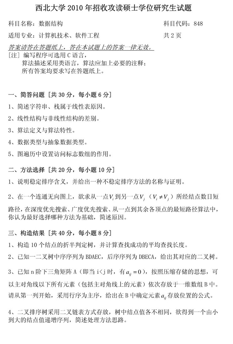 西北大学计算机专硕2015-2010历年考研真题(数据结构,软件工程学科专业基础综合)(11)