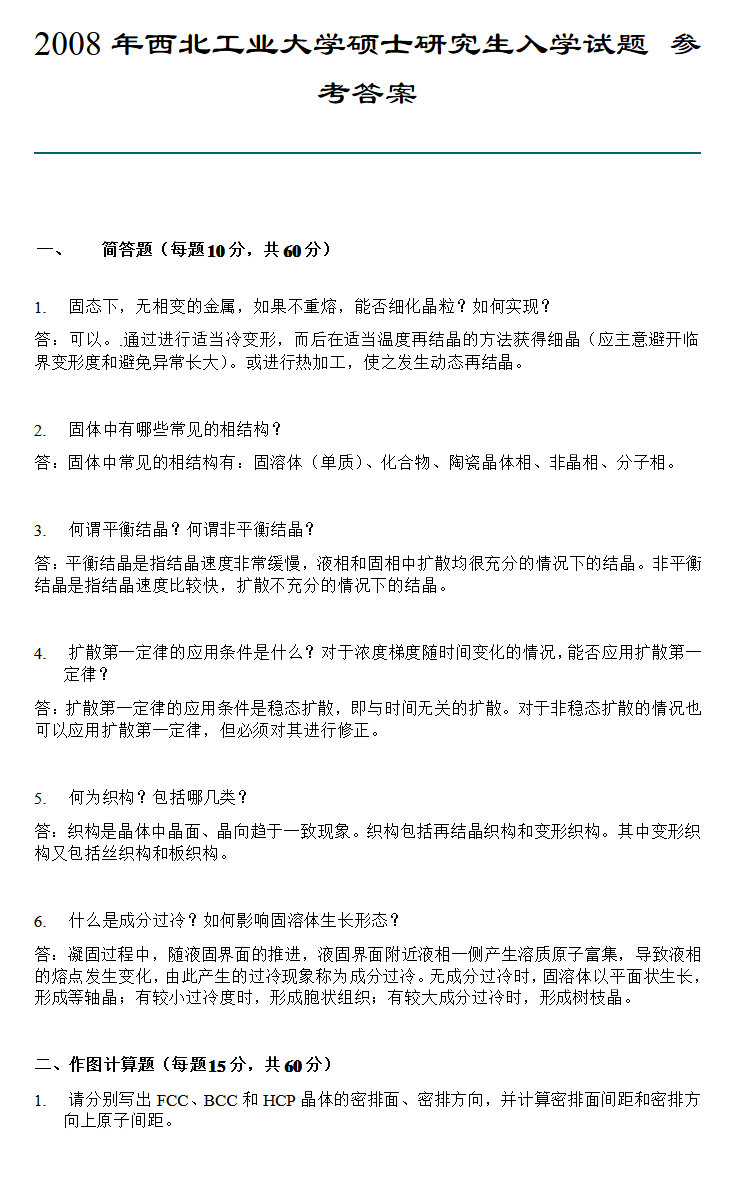 西北工业大学2008-2011材料科学基础考研试题与答案