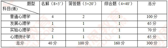 从各科的分值来看,普通心理学作为基础性科目是真题考查的重点,占了总分1/3的分值。实验心理学次之,考查了70分,虽然分值较之普心稍少,但考查难度却是四个科目中最难的,当然这种难度并非超纲的考查,而是一种意外的考查。最后,心理统计和发展心理学各占65分,两科中名解、简答和综合题均是各有1题。