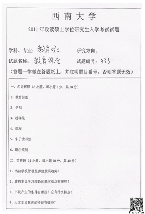 辅导考试考研资料 本站小编 免费考研网 2018-11-02扬州大学2012年333教育综合真题