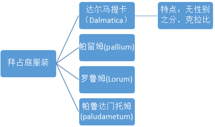 拜占庭文化是希腊、罗马的古典理念、东方的神秘主义和新兴基督教文化这三种完全异质的文化的混合物。拜占庭织物的一大特色是绚丽丰富的色彩,其服装基本沿用罗马帝国末期的样式,由于基督教文化的影响,其服装逐渐失去古罗马服装的朴素和单纯,失去古代多来帕里那种流动的、自然悬垂的衣襞之美,造型变得呆板、僵硬,色彩变得绚丽、华美,流苏、滚边以及宝石装饰非常普遍,表现的重点转移到衣料的质地、色彩和表面装饰上,充满东方文化的特征。同时,给人一种强烈的否定人的存在的绝对的宗教性,人们穿衣服时为了包藏和遮掩身体。且衣服也有“别等级、显贵贱”的工具。