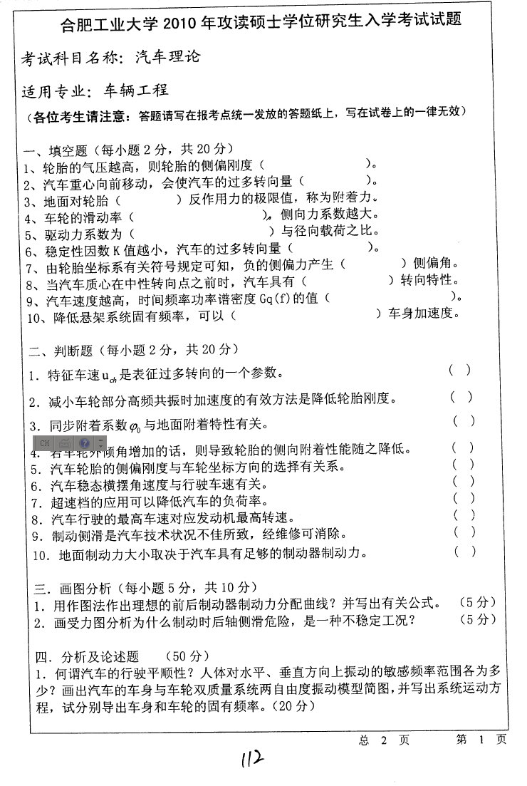 郑州轻工业大学2019年硕士研究生入学考试初试科目考试大纲汽车理论(科目代码:810)本考试大纲适用于报考郑州轻工业大学车辆工程(此处填写学科、专业名称)的硕士研究生的入学考试。一、考试内容及基本要求1.汽车的动力性(1)掌握汽车的动力性、最高车速、原地起步加速时间、超车加速时间、汽车的上坡能力、驱 ...