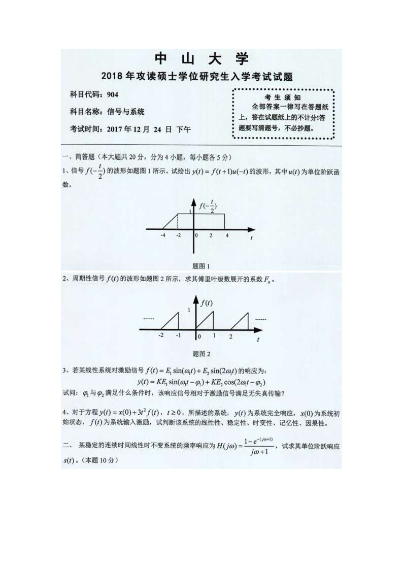 2018中山大学考研904信号系统真题答案解析