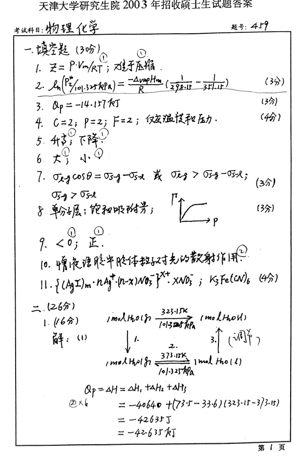 天津大学2003年《物理化学》考研真题答案(版本1)