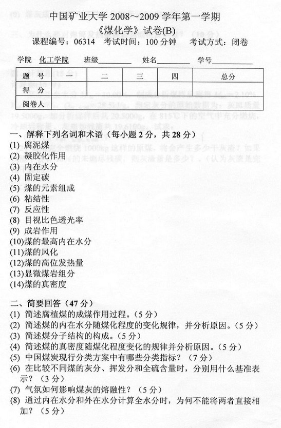 中国矿业大学2008-2009年B煤化学考试试卷带详细答案