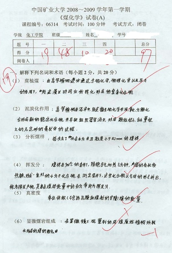 中国矿业大学2008-2009年A煤化学考试试卷带详细答案