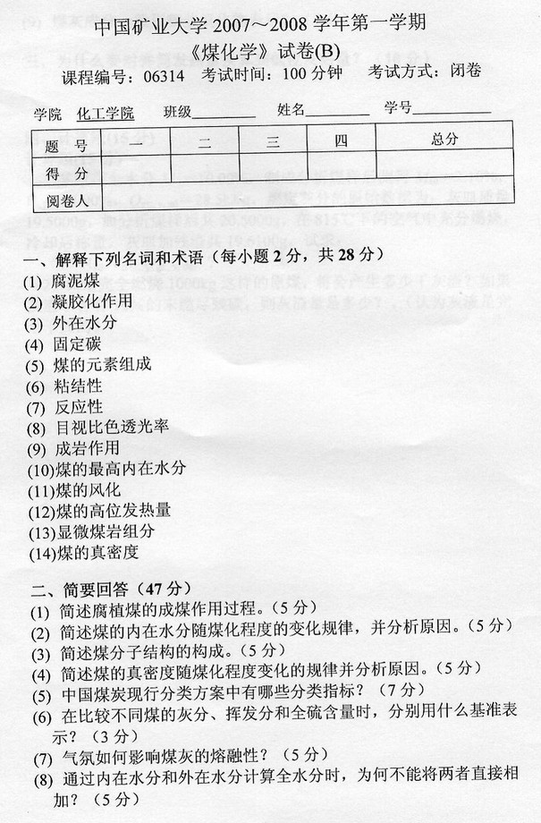 中国矿业大学2007-2008年B煤化学考试试卷带详细答案