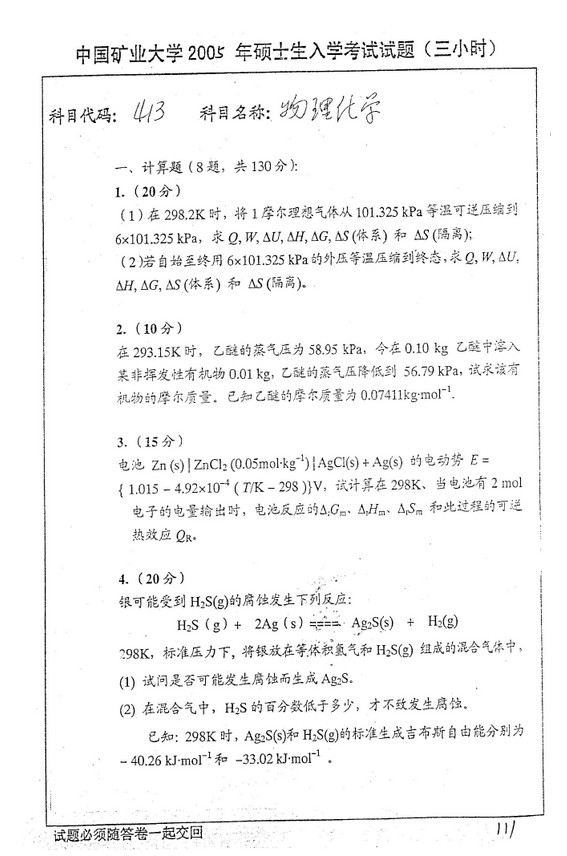 中国矿业大学2005年物理化学考研真题