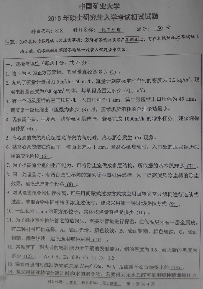 化工原理选择填空题精选 ① 物理吸收操作属于____过程,是一组分通过另一静止组分的____扩散。 ② 当平衡线在所涉及的范围内是斜率为m的直线时,则1/K =1/k +___1/k 。 ① 在填料塔中用清水吸收混合气中NH ,当水泵发生故障上水量减少时,气相总传质 单元数N ______ (A)增加; ...专业课考研资料 本站小编 免费考研网 2019-12-142015中国矿业大学物理化学考研真题