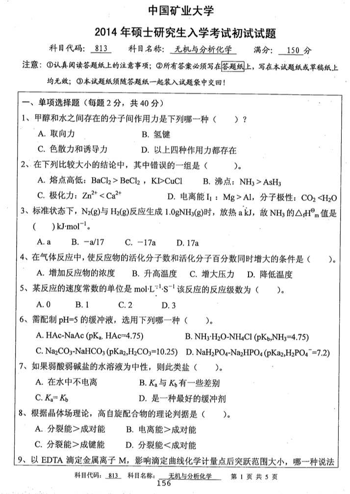 专业课考研资料 本站小编 免费考研网 2019-12-14中国矿业大学2014年物理化学考研真题