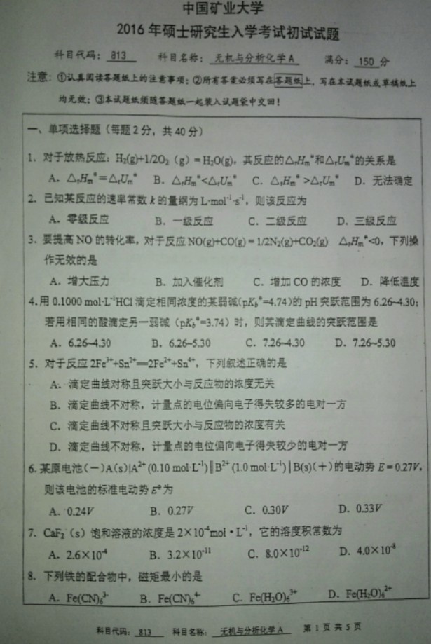 2016年中国矿业大学无机及分析化学考研真题