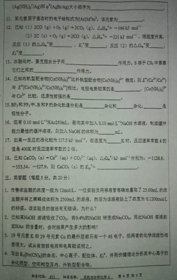 2016年中国矿业大学无机及分析化学考研真题(4)