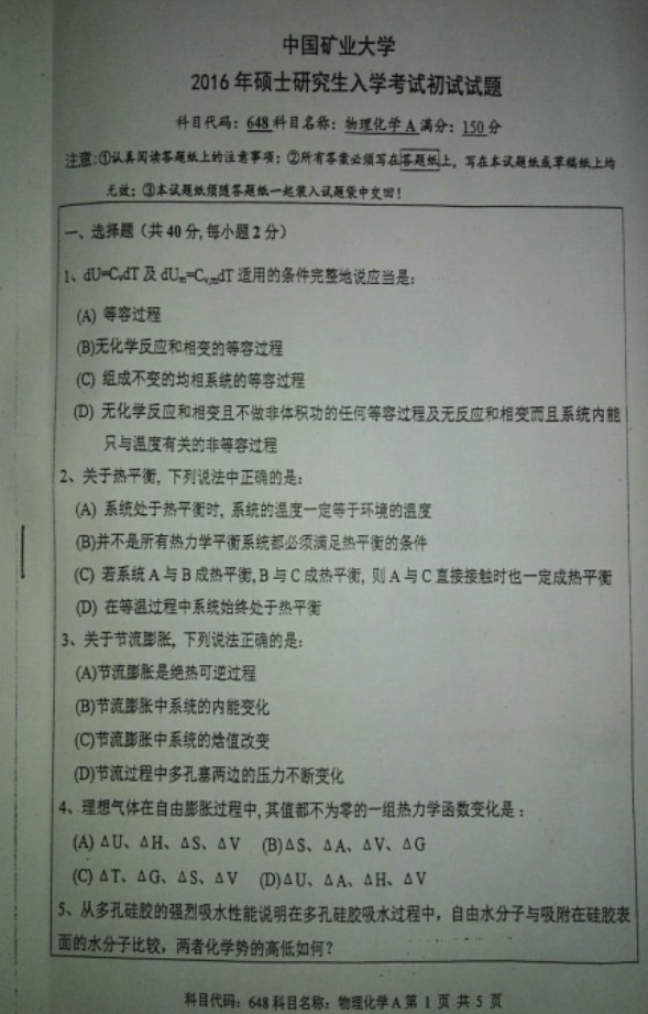 化工原理选择填空题精选 ① 物理吸收操作属于____过程,是一组分通过另一静止组分的____扩散。 ② 当平衡线在所涉及的范围内是斜率为m的直线时,则1/K =1/k +___1/k 。 ① 在填料塔中用清水吸收混合气中NH ,当水泵发生故障上水量减少时,气相总传质 单元数N ______ (A)增加; ...专业课考研资料 本站小编 免费考研网 2019-12-142015中国矿业大学物理化学考研真题