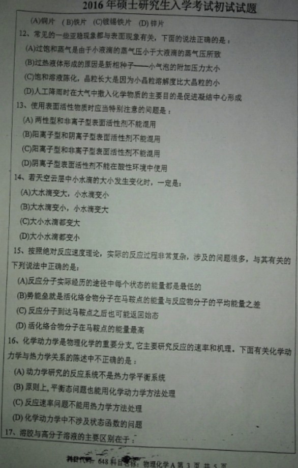 化工原理选择填空题精选 ① 物理吸收操作属于____过程,是一组分通过另一静止组分的____扩散。 ② 当平衡线在所涉及的范围内是斜率为m的直线时,则1/K =1/k +___1/k 。 ① 在填料塔中用清水吸收混合气中NH ,当水泵发生故障上水量减少时,气相总传质 单元数N ______ (A)增加; ...专业课考研资料 本站小编 免费考研网 2019-12-142015中国矿业大学物理化学考研真题