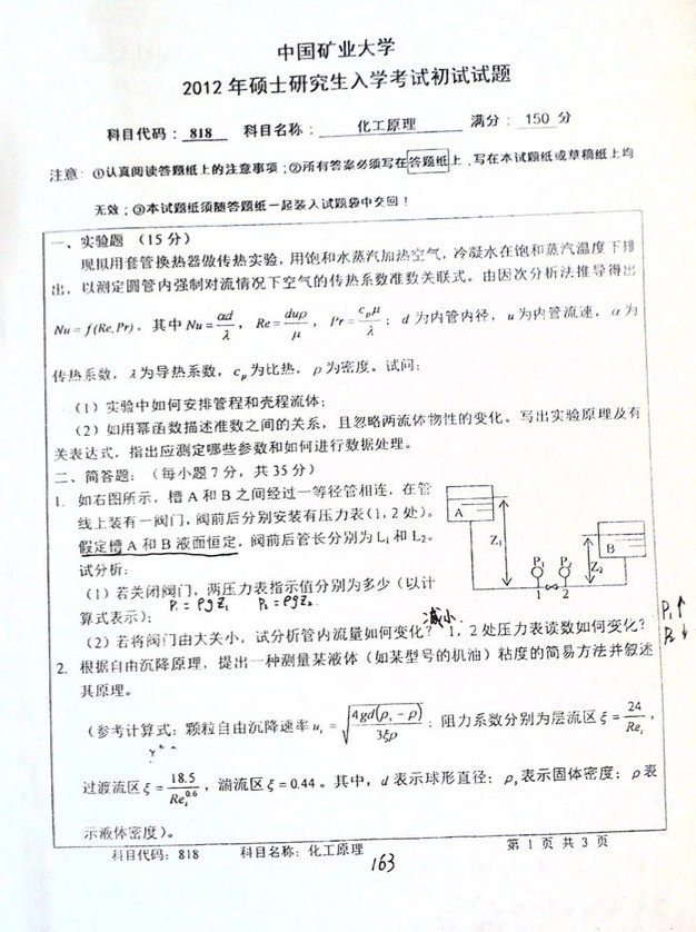 专业课考研资料 本站小编 免费考研网 2019-12-14中国矿业大学2016年化工原理考研真题